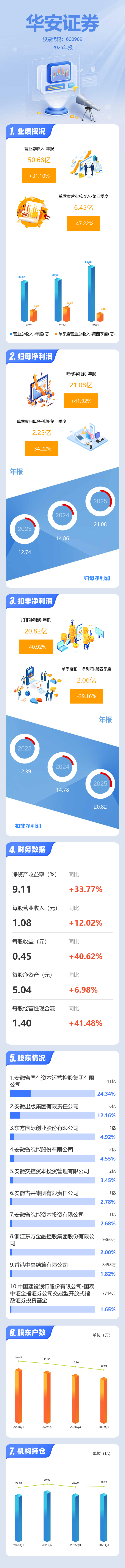 证券之星消息,华安证券2025年年报显示,当年度公司主营收入50.68亿元,同比上升31.11%;归母净利润21.08亿元,同比上升41.92%;扣非净利润20.82亿元,同比上升40.92%;其中2025年第四季度,公司单季度主营收入6.45亿元,同比下降47.22%;单季度归母净利润2.25亿元,同比下降34.22%;单季度扣非净利润2.06亿元,同比下降39.16%;负债率77.52%,投资收益23.83亿元。