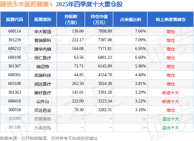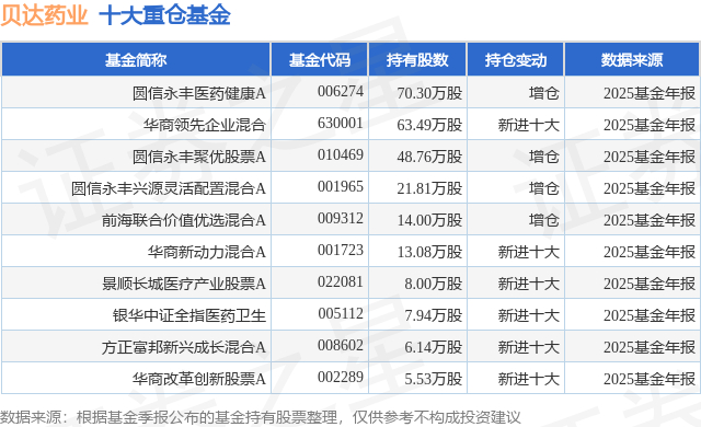 根据2025基金年报公募基金重仓股数据,重仓该股的公募基金共11家,其中持有数量最多的公募基金为圆信永丰基金的圆信永丰医药健康A。圆信永丰医药健康A目前规模为3.14亿元,最新净值1.786(3月26日),较上一交易日下跌1.78%,近一年上涨13.31%。该公募基金现任基金经理为肖世源。肖世源在任的基金产品包括:圆信永丰兴源灵活配置混合A,管理时间为2017年6月21日至今,期间收益率为116.87%;圆信永丰聚优股票A,管理时间为2024年4月3日至今,期间收益率为36.85%。