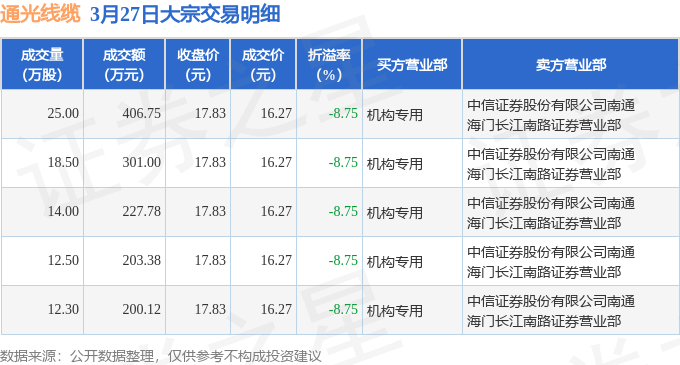 证券之星消息,3月27日通光线缆发生大宗交易,交易数据如下: