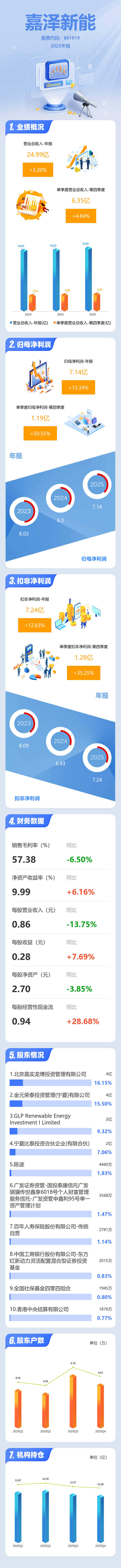 证券之星消息,嘉泽新能2025年年报显示,当年度公司主营收入24.99亿元,同比上升3.2%;归母净利润7.14亿元,同比上升13.35%;扣非净利润7.24亿元,同比上升12.64%;其中2025年第四季度,公司单季度主营收入6.35亿元,同比上升4.84%;单季度归母净利润1.19亿元,同比上升50.55%;单季度扣非净利润1.28亿元,同比上升35.26%;负债率65.13%,投资收益1658.22万元,财务费用4.61亿元,毛利率57.38%。