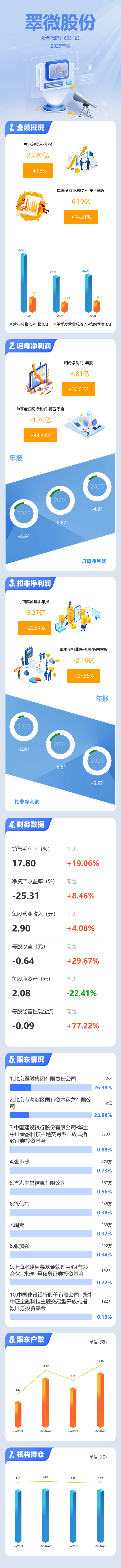 证券之星消息,翠微股份2025年年报显示,当年度公司主营收入23.2亿元,同比上升4.08%;归母净利润-4.81亿元,同比上升30.01%;扣非净利润-5.27亿元,同比上升22.54%;其中2025年第四季度,公司单季度主营收入6.1亿元,同比上升14.31%;单季度归母净利润-1.7亿元,同比上升44.85%;单季度扣非净利润-2.16亿元,同比上升27.55%;负债率72.91%,投资收益249.14万元,财务费用7687.48万元,毛利率17.8%。