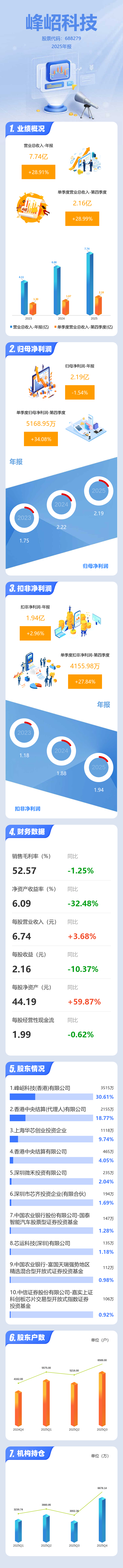 证券之星消息,峰岹科技2025年年报显示,当年度公司主营收入7.74亿元,同比上升28.91%;归母净利润2.19亿元,同比下降1.54%;扣非净利润1.94亿元,同比上升2.96%;其中2025年第四季度,公司单季度主营收入2.16亿元,同比上升29.0%;单季度归母净利润5168.95万元,同比上升34.08%;单季度扣非净利润4155.98万元,同比上升27.85%;负债率2.86%,投资收益5229.58万元,财务费用-88.53万元,毛利率52.57%。