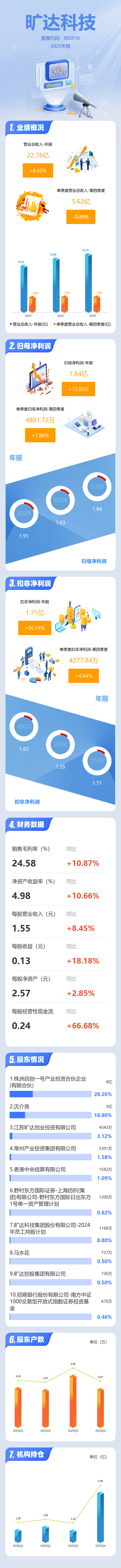 证券之星消息,旷达科技2025年年报显示,当年度公司主营收入22.76亿元,同比上升8.46%;归母净利润1.84亿元,同比上升12.65%;扣非净利润1.71亿元,同比上升26.74%;其中2025年第四季度,公司单季度主营收入5.62亿元,同比下降0.89%;单季度归母净利润4881.72万元,同比上升7.87%;单季度扣非净利润4277.84万元,同比上升4.84%;负债率19.03%,投资收益-2726.84万元,财务费用338.71万元,毛利率24.58%。