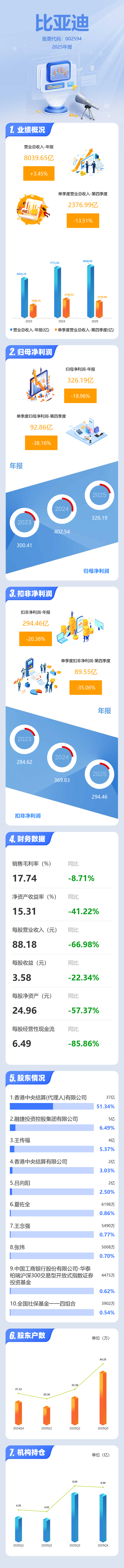 证券之星消息,比亚迪2025年年报显示,当年度公司主营收入8039.65亿元,同比上升3.46%;归母净利润326.19亿元,同比下降18.97%;扣非净利润294.46亿元,同比下降20.38%;其中2025年第四季度,公司单季度主营收入2376.99亿元,同比下降13.52%;单季度归母净利润92.86亿元,同比下降38.16%;单季度扣非净利润89.55亿元,同比下降35.06%;负债率70.74%,投资收益28.57亿元,财务费用-6.49亿元,毛利率17.74%。