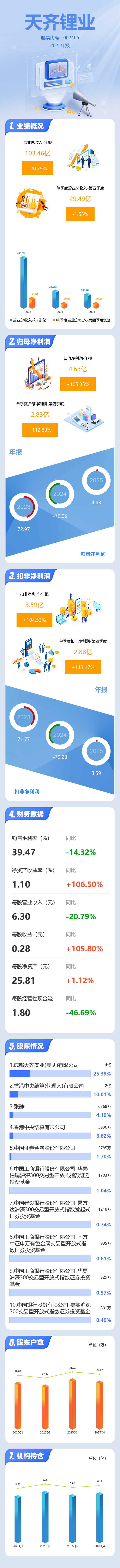 证券之星消息,天齐锂业2025年年报显示,当年度公司主营收入103.46亿元,同比下降20.8%;归母净利润4.63亿元,同比上升105.85%;扣非净利润3.59亿元,同比上升104.53%;其中2025年第四季度,公司单季度主营收入29.49亿元,同比下降1.66%;单季度归母净利润2.83亿元,同比上升112.83%;单季度扣非净利润2.88亿元,同比上升113.17%;负债率28.04%,投资收益5.47亿元,财务费用-2.26亿元,毛利率39.47%。