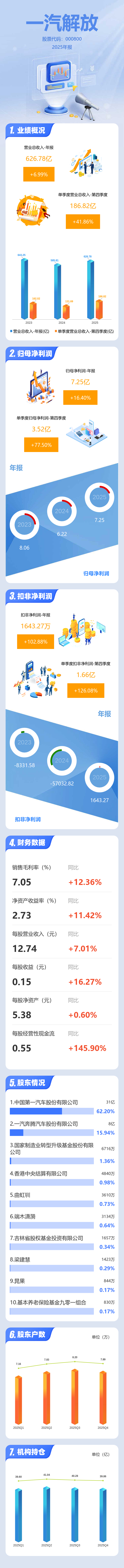 证券之星消息,一汽解放2025年年报显示,当年度公司主营收入626.78亿元,同比上升6.99%;归母净利润7.25亿元,同比上升16.41%;扣非净利润1643.27万元,同比上升102.88%;其中2025年第四季度,公司单季度主营收入186.82亿元,同比上升41.87%;单季度归母净利润3.52亿元,同比上升77.51%;单季度扣非净利润1.66亿元,同比上升126.09%;负债率63.01%,投资收益-4316.48万元,财务费用-6.03亿元,毛利率7.05%。