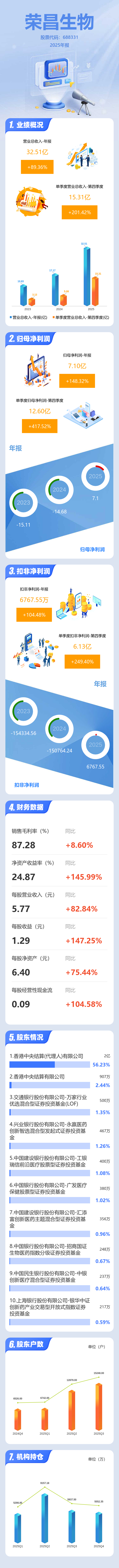 证券之星消息,荣昌生物2025年年报显示,当年度公司主营收入32.51亿元,同比上升89.36%;归母净利润7.1亿元,同比上升148.33%;扣非净利润6767.55万元,同比上升104.49%;其中2025年第四季度,公司单季度主营收入15.31亿元,同比上升201.43%;单季度归母净利润12.6亿元,同比上升417.52%;单季度扣非净利润6.13亿元,同比上升249.4%;负债率50.21%,投资收益-443.74万元,财务费用6482.68万元,毛利率87.28%。