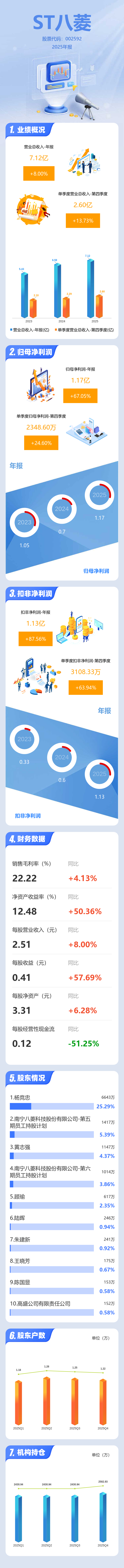 证券之星消息,ST八菱2025年年报显示,当年度公司主营收入7.12亿元,同比上升8.01%;归母净利润1.17亿元,同比上升67.06%;扣非净利润1.13亿元,同比上升87.56%;其中2025年第四季度,公司单季度主营收入2.6亿元,同比上升13.74%;单季度归母净利润2348.6万元,同比上升24.61%;单季度扣非净利润3108.33万元,同比上升63.94%;负债率28.46%,投资收益5787.82万元,财务费用-323.18万元,毛利率22.22%。