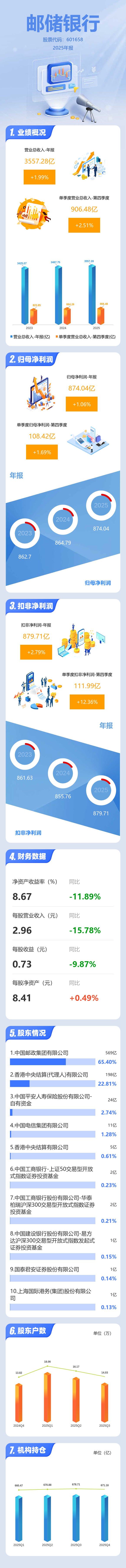 证券之星消息,邮储银行2025年年报显示,当年度公司主营收入3557.28亿元,同比上升1.99%;归母净利润874.04亿元,同比上升1.07%;扣非净利润879.71亿元,同比上升2.8%;其中2025年第四季度,公司单季度主营收入906.48亿元,同比上升2.51%;单季度归母净利润108.42亿元,同比上升1.7%;单季度扣非净利润111.99亿元,同比上升12.36%;负债率93.78%,投资收益443.87亿元。