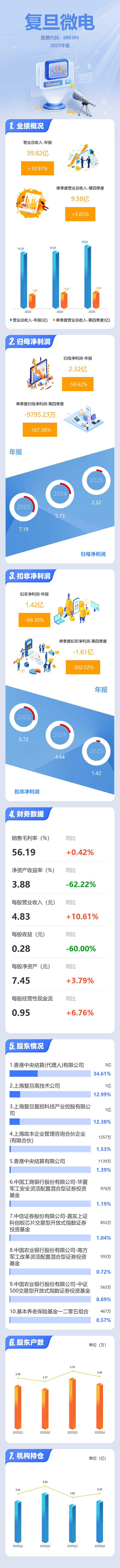 证券之星消息,复旦微电2025年年报显示,当年度公司主营收入39.82亿元,同比上升10.92%;归母净利润2.32亿元,同比下降59.42%;扣非净利润1.42亿元,同比下降69.3%;其中2025年第四季度,公司单季度主营收入9.58亿元,同比上升5.65%;单季度归母净利润-9795.23万元,同比下降167.39%;单季度扣非净利润-1.61亿元,同比下降302.02%;负债率26.63%,投资收益-185.29万元,财务费用3187.62万元,毛利率56.19%。