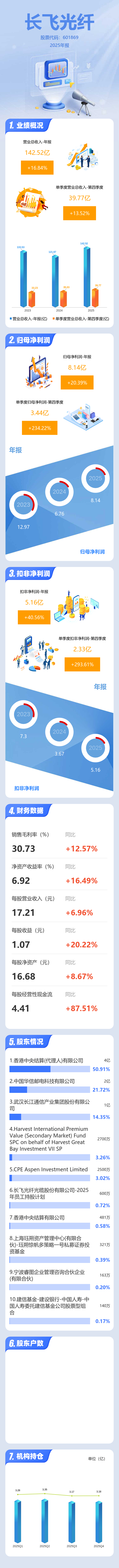 证券之星消息,长飞光纤2025年年报显示,当年度公司主营收入142.52亿元,同比上升16.85%;归母净利润8.14亿元,同比上升20.4%;扣非净利润5.16亿元,同比上升40.56%;其中2025年第四季度,公司单季度主营收入39.77亿元,同比上升13.53%;单季度归母净利润3.44亿元,同比上升234.23%;单季度扣非净利润2.33亿元,同比上升293.61%;负债率51.12%,投资收益-2.19亿元,财务费用2.64亿元,毛利率30.73%。