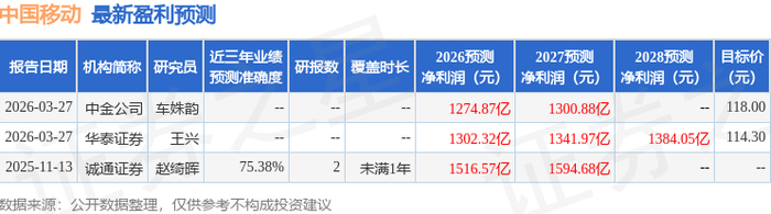 证券之星数据中心根据近三年发布的研报数据计算,诚通证券赵绮晖研究员团队对该股研究较为深入,近三年预测准确度均值为75.38%,其预测2026年度归属净利润为盈利1516.57亿,根据现价换算的预测PE为301.35。