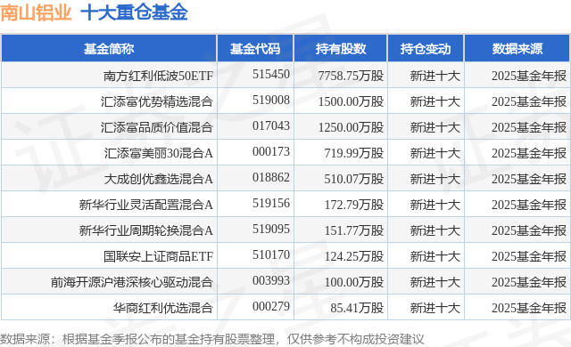 根据2025基金年报公募基金重仓股数据,重仓该股的公募基金共21家,其中持有数量最多的公募基金为南方基金的南方红利低波50ETF。南方红利低波50ETF目前规模为150.39亿元,最新净值1.4345(3月27日),较上一交易日下跌0.15%,近一年上涨7.14%。该公募基金现任基金经理为崔蕾。崔蕾在任的基金产品包括:南方有色金属ETF联接A,管理时间为2019年7月12日至今,期间收益率为199.25%;南方中证1000ETF,管理时间为2019年7月12日至今,期间收益率为84.18%;南方中证申万有色金属ETF,管理时间为2019年7月12日至今,期间收益率为214.56%;