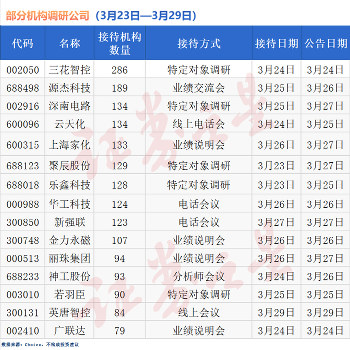 随着A股市场年报披露进入收官阶段,机构投资者的调研热情持续升温。根据Choice数据统计,3月23日至3月29日这一周内,沪深北三市共有近140家上市公司发布了投资者关系活动记录,接待了来自公募基金、券商、保险资管、私募等各类机构的实地走访与线上交流。