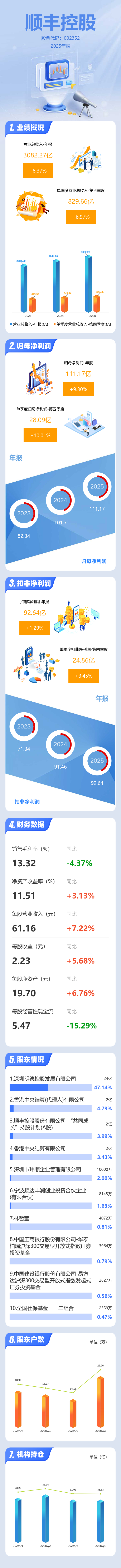 证券之星消息,顺丰控股2025年年报显示,当年度公司主营收入3082.27亿元,同比上升8.37%;归母净利润111.17亿元,同比上升9.31%;扣非净利润92.64亿元,同比上升1.29%;其中2025年第四季度,公司单季度主营收入829.66亿元,同比上升6.97%;单季度归母净利润28.09亿元,同比上升10.01%;单季度扣非净利润24.86亿元,同比上升3.46%;负债率49.03%,投资收益14.68亿元,财务费用17.89亿元,毛利率13.32%。