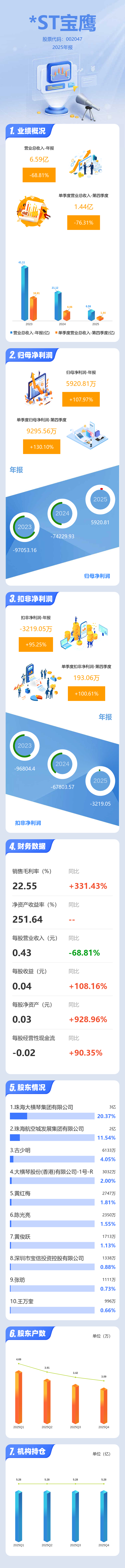 证券之星消息,*ST宝鹰2025年年报显示,当年度公司主营收入6.59亿元,同比下降68.81%;归母净利润5920.81万元,同比上升107.98%;扣非净利润-3219.05万元,同比上升95.25%;其中2025年第四季度,公司单季度主营收入1.44亿元,同比下降76.32%;单季度归母净利润9295.56万元,同比上升130.1%;单季度扣非净利润193.06万元,同比上升100.62%;负债率96.52%,投资收益2916.51万元,财务费用2411.18万元,毛利率22.55%。