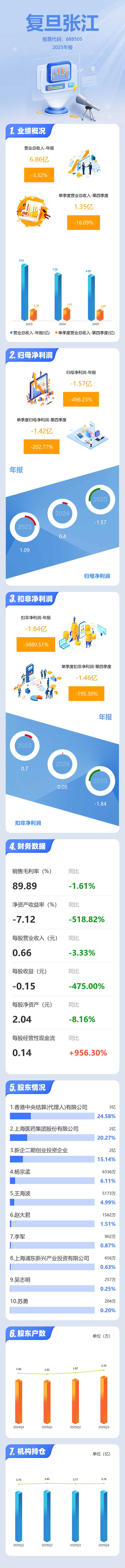 证券之星消息,复旦张江2025年年报显示,当年度公司主营收入6.86亿元,同比下降3.33%;归母净利润-1.57亿元,同比下降496.23%;扣非净利润-1.84亿元,同比下降3680.51%;其中2025年第四季度,公司单季度主营收入1.35亿元,同比下降16.09%;单季度归母净利润-1.42亿元,同比下降202.78%;单季度扣非净利润-1.46亿元,同比下降195.31%;负债率11.46%,投资收益-984.62万元,财务费用-219.16万元,毛利率89.89%。