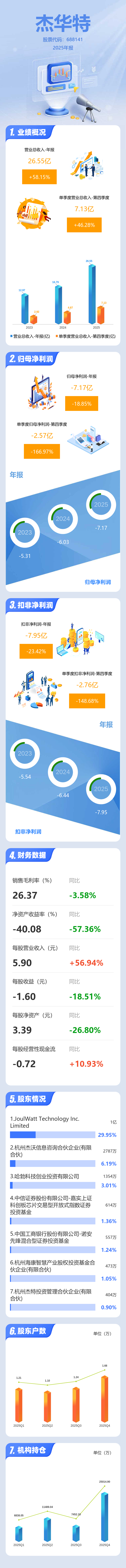 证券之星消息,杰华特2025年年报显示,当年度公司主营收入26.55亿元,同比上升58.15%;归母净利润-7.17亿元,同比下降18.85%;扣非净利润-7.95亿元,同比下降23.42%;其中2025年第四季度,公司单季度主营收入7.13亿元,同比上升46.28%;单季度归母净利润-2.57亿元,同比下降166.97%;单季度扣非净利润-2.76亿元,同比下降148.68%;负债率65.18%,投资收益81.36万元,财务费用-2.03万元,毛利率26.37%。