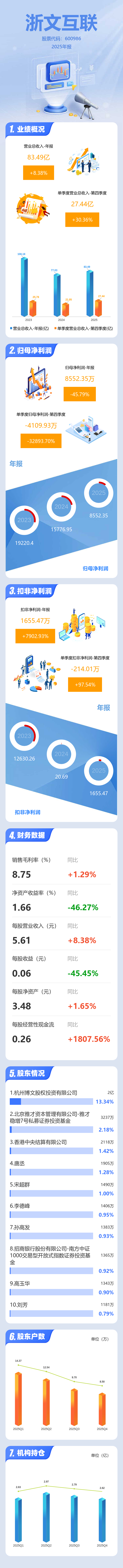 证券之星消息,浙文互联2025年年报显示,当年度公司主营收入83.49亿元,同比上升8.38%;归母净利润8552.35万元,同比下降45.79%;扣非净利润1655.47万元,同比上升7902.94%;其中2025年第四季度,公司单季度主营收入27.44亿元,同比上升30.37%;单季度归母净利润-4109.93万元,同比下降32893.7%;单季度扣非净利润-214.01万元,同比上升97.55%;负债率45.18%,投资收益2024.83万元,财务费用2895.08万元,毛利率8.75%。