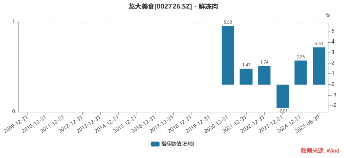 值得注意的是,通常猪周期下行期持续2-3年,但本轮周期因产能恢复过猛而延长,同时,需求端受多重因素影响,猪肉消费增长乏力,今年上半年猪肉产量同比增长,但生猪价格呈下跌趋势。这种价格低位运行直接冲击了龙大美食的盈利水平。报告期内,公司鲜冻肉的毛利率仅为3.5%,而在过去四年,该产品毛利率未超过2.5%,其中2023年的毛利率低至-2.21%,鲜冻肉板块的盈利乏力也直接拖累整体利润水平。