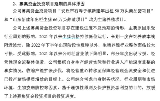 此外,龙大美食还于近期再次对两大生猪养殖募投项目“安丘市石埠子镇新建年出栏50万头商品猪项目”和“山东新建年出栏生猪66万头养殖项目”延期至2026年8月。公司坦言,前述项目存在建设进度不及预期的情形,主要原因系受行业周期的影响。公司对非核心项目的收缩,即反映出其对项目风险的审慎,也暴露了其在周期低谷期推进上游布局的被动性。