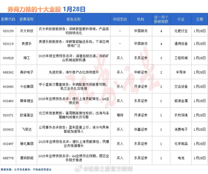 据证券之星数据库不完全统计,1月28日券商共给予超10家A股上市公司“买入”评级。从行业分布看,券商1月28日关注的个股聚焦于化肥、通用设备、工程机械、半导体、交运设备、能源金属、农牧饲渔、消费电子、化学制品、电池等行业。