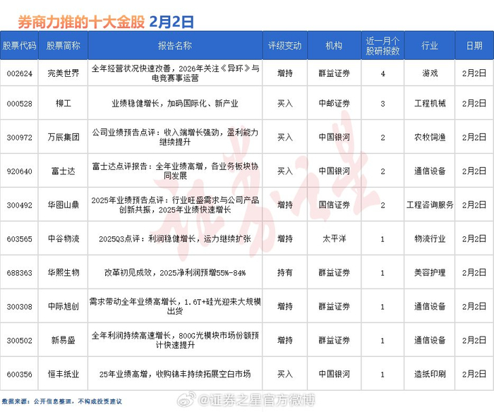 据证券之星数据库不完全统计,2月2日券商共给予超10家A股上市公司“买入”评级。从行业分布看,券商2月2日关注的个股聚焦于游戏、工程机械、农牧饲渔、通信设备、工程咨询服务、物流、美容护理、造纸印刷等行业。