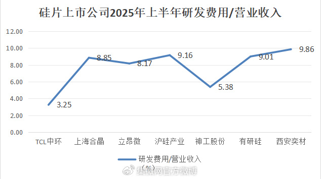 2025年上半年,TCL中环以4.36亿元的研发费用位居行业首位,远超其他企业,研发费用同比增长率也最高,达到26%,体现了其雄厚的资金实力和对技术领先地位的坚决维护。沪硅产业2025年上半年的研发费用为1.55亿元,立昂微研发费用1.36亿元,西安奕材1.28亿元,成为第二梯队。上海合晶研发费用0.55亿元,有研硅0.44亿元,神工股份0.11亿元,组成第三梯队。