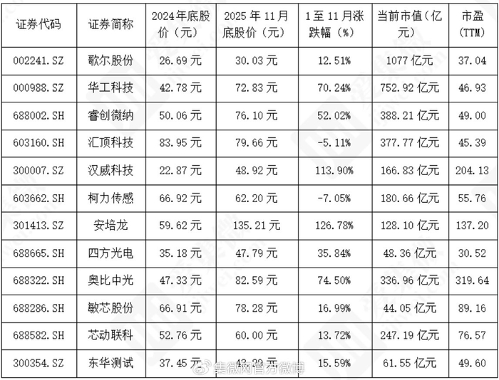 *2025年1-11月国内半导体传感器行业主要上市公司股价表现