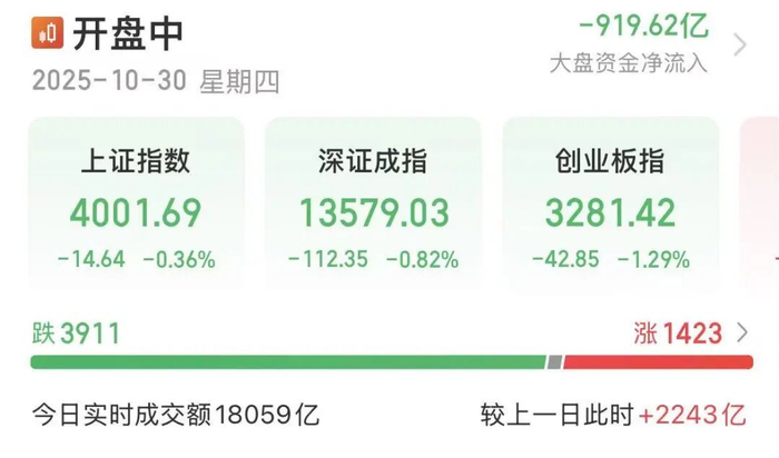 截至发稿,深证成指跌幅扩大至0.82%,沪指跌0.36%,创业板指跌1.29%。算力硬件、煤炭、游戏板块跌幅居前。全市场成交额超1.8万亿元,较上个交易日此时放量2243亿元。