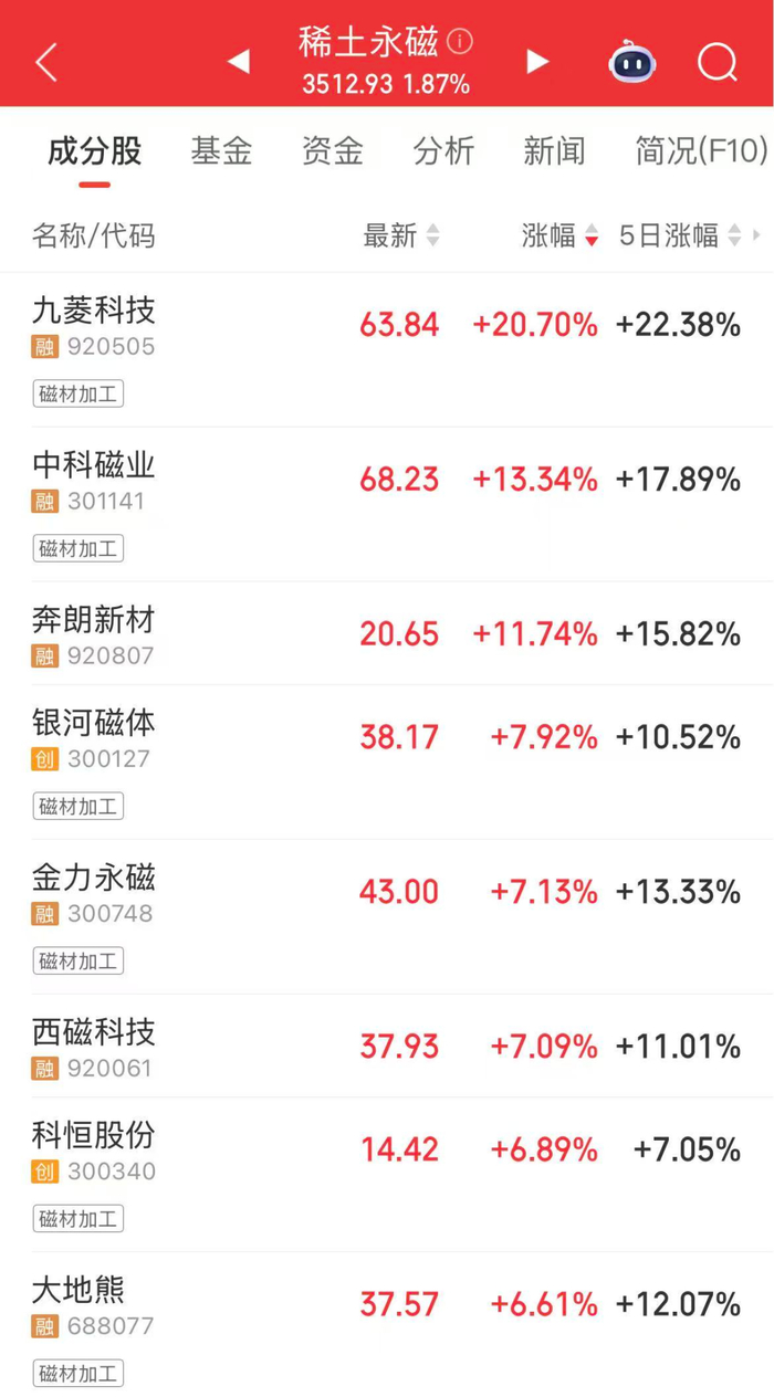 10月30日午后,稀土永磁板块突然拉升,九菱科技涨超20%,中科磁业涨超13%,奔朗新材、银河磁体、金力永磁等跟涨。