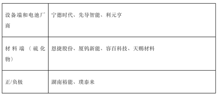 一是设备端和电池厂商。2026年全固态电池中试线将密集落地,生产设备是固态电池产业化推进的基础和关键环节,将先于材料端受益。重点标的:宁德时代、先导智能、利元亨等。