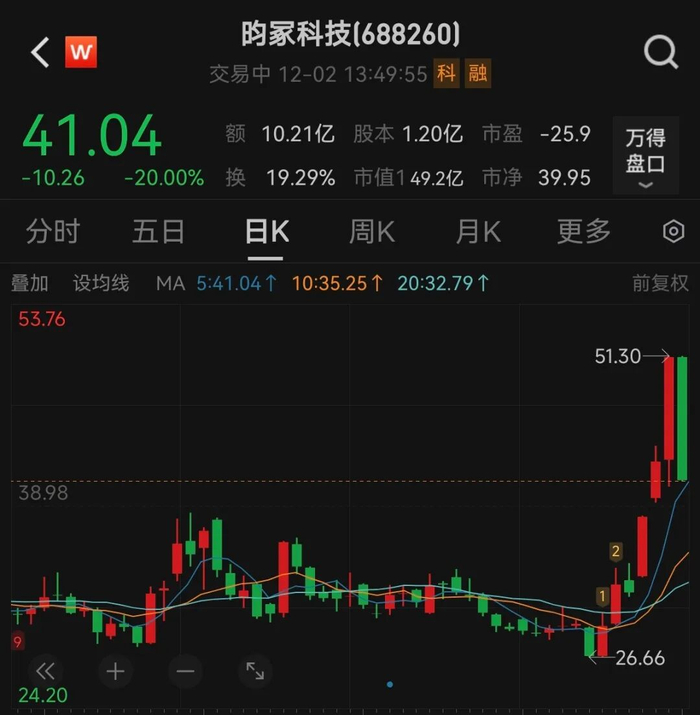 12月2日,昀冢科技(688260)盘中“20cm”跌停,报41.04元。得益于消费电子板块活跃,公司股价上一个交易日获“20cm”涨停,报51.30元,此前6个交易日,该股累计大涨超90%。