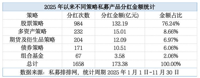 分策略来看,股票策略是年内分红“主力军”。据统计,截至11月30日,今年以来股票策略私募基金合计分红984次,金额达132.19亿元,占分红总额的76.24%,远超其他策略私募基金。