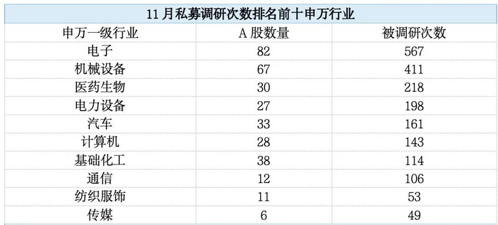 第三方平台数据显示,11月共有885家私募参与到A股调研活动中,覆盖了28个申万一级行业中的439只个股,合计调研频次达2341次。