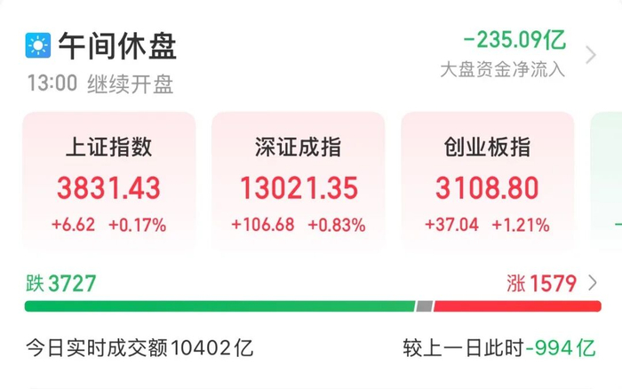 12月17日早盘,A股三大指数集体反弹,创业板指领涨。截至午间收盘,上证指数报3831.43点,涨0.17%;深证成指、创业板指分别涨0.83%、1.21%。沪深北三市半日成交10402亿元。AI主线再度活跃,新易盛、中际旭创成交额均超百亿元,新易盛(300502)半日成交131亿元居所有个股首位。