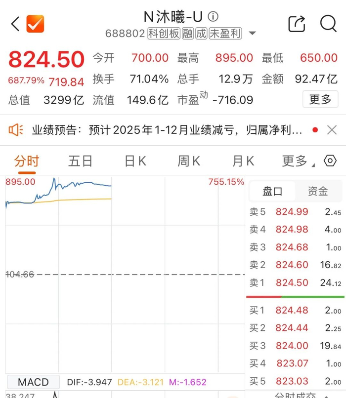 今日,GPU明星股沐曦股份正式登陆科创板,开盘后一路冲高,盘中一度上涨755%,股价最高触及895元/股,盘中总市值一度超越摩尔线程。截至午间收盘,沐曦股份上涨687.79%,报824.50元/股,半日成交额92.47亿元,最新总市值3299亿元。