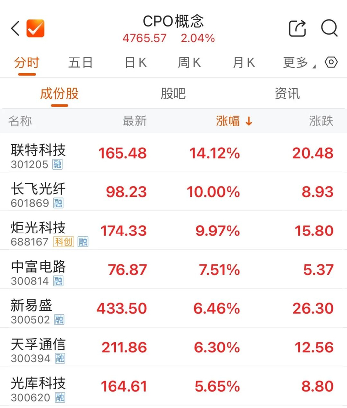 早盘,CPO概念震荡反弹,联特科技盘中涨近15%,股价创历史新高。截至午间收盘,长飞光纤、环旭电子涨停,光模块龙头新易盛、天孚通信、中际旭创均涨幅居前。