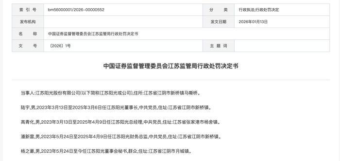 1月13日,江苏证监局发布行政处罚决定书,直指主板退市公司江苏阳光股份有限公司(下称“江苏阳光”)。