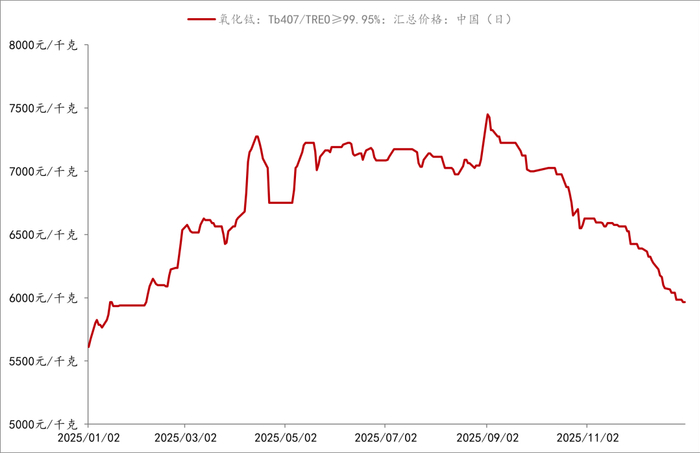 2025年,主要轻稀土产品价格有所上涨,但部分中重稀土产品价格仍呈下行态势。上海钢联数据显示,2025年12月31日国内氧化镨钕价格报60.75万元/吨,相较于2025年年初上涨52.45%。中重稀土方面,2025年下半年氧化镝价格降幅达16.7%,进入四季度后下跌速率加快。2025年氧化铽价格则呈现先上升后下降的走势,下半年价格降幅达15.8%。