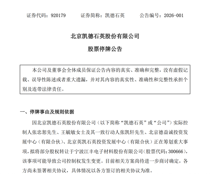 1月29日,半导体材料领域两家上市公司——深交所创业板公司江丰电子(300666)与北交所公司凯德石英(920179)同步发布公告,宣布将于1月30日开市起停牌。