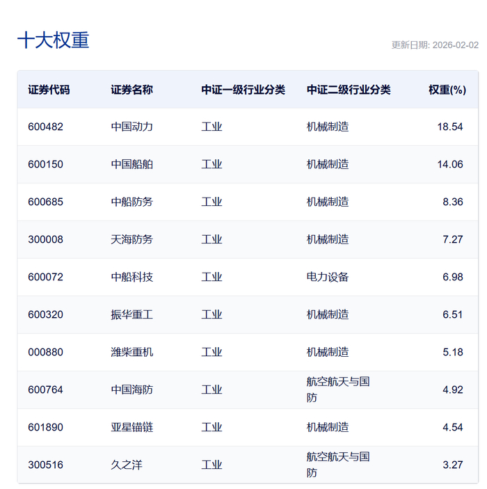 从该ETF前十大权重股来看,截至2月2日,包括中国动力、中国船舶、中船防务、天海防务、中船科技等。
