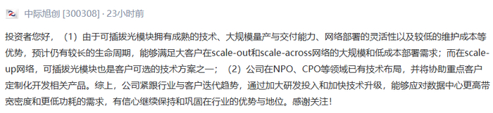 中际旭创表示,公司在NPO、CPO等领域已有技术布局,并将协助重点客户定制化开发相关产品。公司紧跟行业与客户迭代趋势,通过加大研发投入和加快技术升级,能够应对数据中心更高带宽密度和更低功耗的需求,有信心继续保持和巩固在行业的优势与地位。