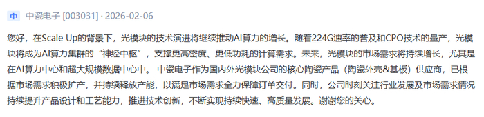 中瓷电子表示,随着224G速率的普及和CPO技术的量产,光模块将成为AI算力集群的“神经中枢”,支撑更高密度、更低功耗的计算需求。中瓷电子作为国内外光模块公司的核心陶瓷产品(陶瓷外壳&基板)供应商,已根据市场需求积极扩产,并持续释放产能,以满足市场需求全力保障订单交付。