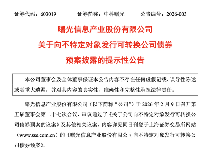 2月9日晚间,中科曙光公告称,拟向不特定对象发行可转债募资不超过80亿元,用于面向人工智能的先进算力集群系统项目、下一代高性能AI训推一体机项目、国产化先进存储系统项目。这也是上交所发布再融资优化措施后,沪市首单再融资示范案例。