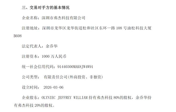 需关注的是,经纬辉开此次交易对手方弗杰科技成立仅一周时间。公告显示,弗杰科技设立于2026年3月6日,注册资本1000万元人民币,经营范围涵盖电子专用材料研发、显示器件销售、电子产品销售等。股东方面,OLYNIEC JEFFREY WILLIAM持有弗杰科技80%的股权,余乔华持有弗杰科技20%的股权。