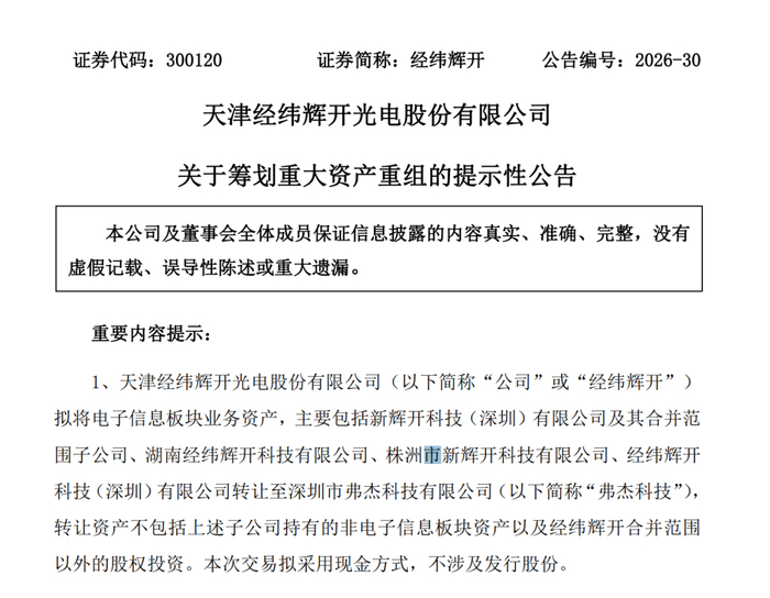 3月13日晚间,经纬辉开(300120)公告,公司拟将电子信息板块业务资产转让至深圳市弗杰科技有限公司(简称“弗杰科技”)。本次交易预计构成重大资产重组,不会导致公司控股股东和实际控制人发生变更。