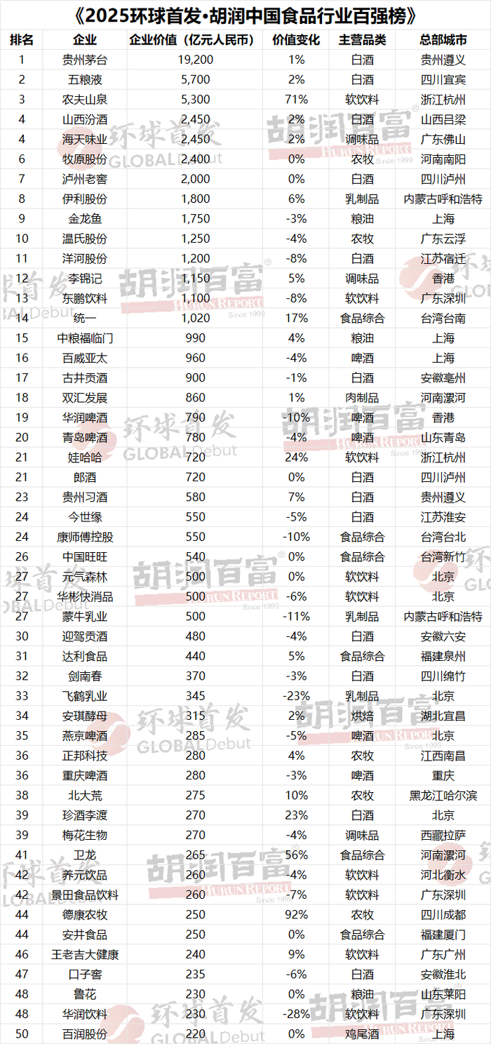 长沙晚报掌上长沙12月19日讯(全媒体记者 曹开阳)12月19日,《2025环球首发·胡润中国食品行业百强榜》(2025 GlobalDebut· Hurun China Food Industry Top 100)在上海发布。该榜单按照企业市值或估值进行排名,其中上市公司市值按照2025年10月31日的收盘价计算,非上市公司估值参考同行业上市公司或者根据最新一轮融资情况进行估算。这是胡润研究院第五次发布“中国食品行业百强榜”。
