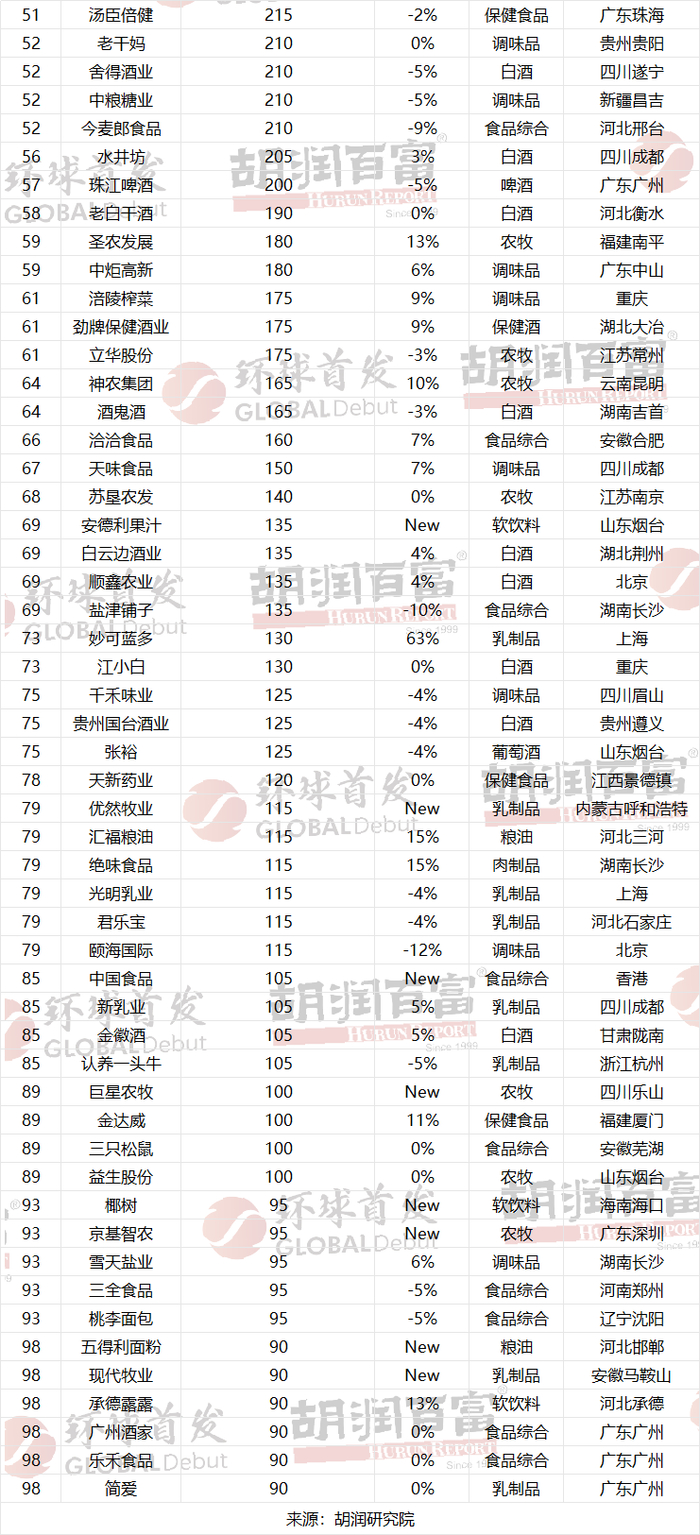 分析榜单可见,有8家企业新上榜,分别是安德利果汁、优然牧业、中国食品、巨星农牧、椰树、京基智农、五得利面粉、现代牧业,价值增幅最快的则是德康农牧(92%)、农夫山泉(71%)、妙可蓝多(63%)、卫龙(56%)、娃哈哈(24%)、珍酒李渡(23%);7家企业价值跌幅超10%,分别是华润饮料(跌28%)、飞鹤(跌23%)、颐海国际(跌12%)、蒙牛(跌11%),以及盐津铺子、华润啤酒和康师傅控股(均跌10%)。