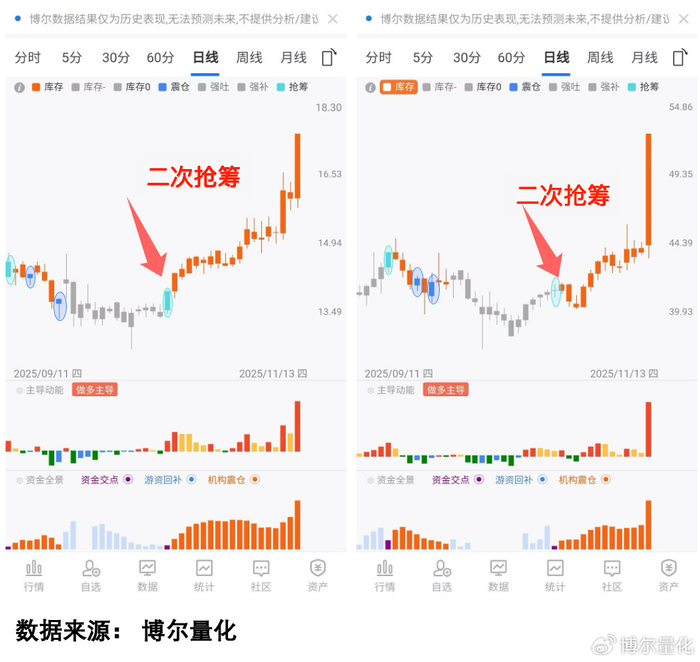 我们可以看到当第一次「游资抢筹」现象出现后,股价短暂的上涨两天之后就开遭遇震荡,在这个震荡过程中,我们注意到连续出现了两次「机构震仓」现象,很明显这说明股价的调整实际就是机构大资金的故意打压,这时候就要注意了。不仅如此,调整到一定阶段之后,我们发现又出现了「游资抢筹」现象,很明显游资反应过来了,但因为这一次股价在低位,那机构当然不舍得再打压,也就只能顺势拉起来了。